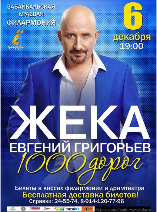 Автор-исполнитель в жанре шансон Евгений Григорьев, известный под творческим псевдонимом Жека, выступит 6 декабря в 19 часов в Забайкальской краевой филармонии им. О.Л. Лундстрема с новой сольной программой «1 000 дорог». Десятый сольный альбом Жеки «1 000 дорог» вышел в феврале 2017 года. 2 года автор знаменитой «Рюмки водки на столе» трудился над новой пластинкой, в которую вошли 10 треков, в том числе авторские и два бонус-трека в новом звучании. На своём праздничном концерте Жека исполнит совершенно новые песни из альбома.