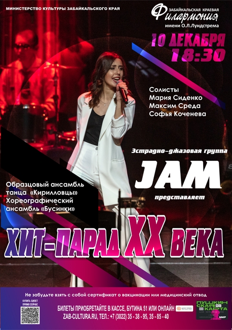 В большом концертном зале филармонии премьерную программу «Хит – Парад 20 века» представит эстрадно- джазовая группа «JAM» и солисты Мария Сиденко и Максим Среда.