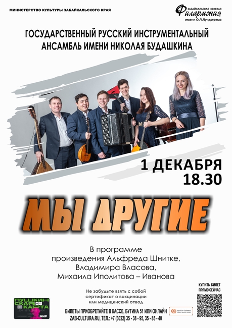 декабря в 18:30 на сцене большого концертного зала Забайкальской краевой филармонии артисты Государственного Русского инструментального ансамбля имени Николая Будашкина представят новую концертную программу «Мы другие».