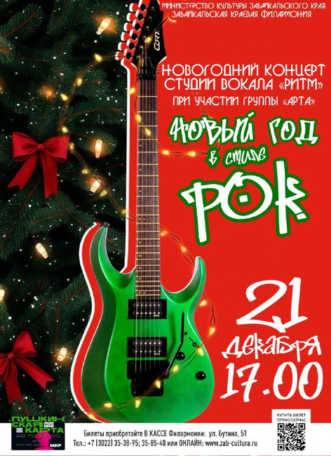 Концерт студии вокала «Ритм» «Новый год в стиле рок» - это маленькое предновогоднее перевоплощение, где каждый участник предстанет в образе рок-звезды. В концерте выступят как совсем юные вокалисты, так и взрослые. Так же на сцену выйдет наша детская подающая надежды рок-группа «Арта» и сыграет с участниками концерта и самостоятельно. В концерте будут звучать хиты русского рока: Чичерина, Звери, Маша и медведи, Алиса, Цой и зарубежная классика - Nirvana, The Cranberries и др.