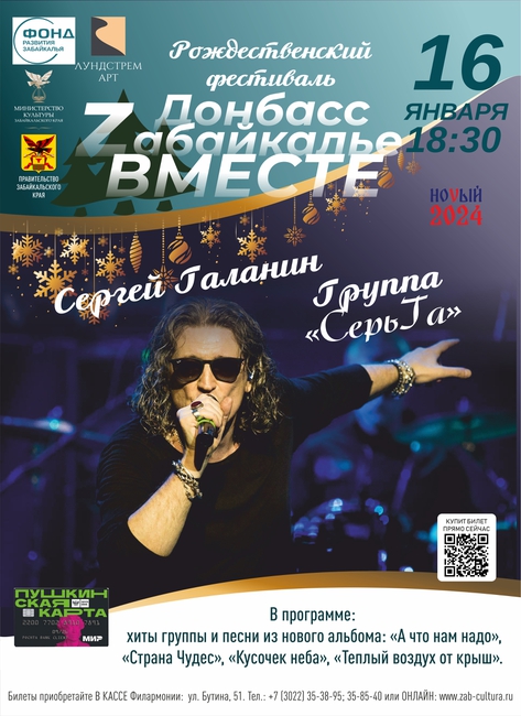 16 января в 18:30 в большом концертном зале Забайкальской филармонии пройдет концерт российской рок-группы «СерьГа» основателем которой является советский и российский рок-музыкант, поэт, композитор Сергей Галанин. Группа уже более 25 лет радует поклонников тяжёлой музыки достойным репертуаром. Девиз коллектива — «Для тех, у кого есть уши». Репертуар группы «СерьГа» — это лирические треки, баллады и песни в стиле хард-рок с элементами блюза. Состав группы неоднократно менялся, и только Сергей Галанин остаётся неизменным участником коллектива. Группа продолжает гастролировать. Концерт проходит в рамках уже ставшего традиционным рождественского фестиваля «Донбасс и Zабайкалье. Вместе». В специально подготовленной для фестиваля программе прозвучат легендарные хиты и песни из нового альбома: «А что нам надо», «Страна Чудес», «Кусочек неба», «Теплый воздух от крыш» и другие хиты.