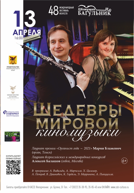 3 апреля в 16:00 в органном зале Забайкальской филармонии в рамках 48-го Международного фестиваля искусств «Цветущий Багульник» Лауреат всероссийских и международных конкурсов Алексей Балашов (гобой) и лауреат премии «Орган года» Мария Блажевич орган) представят гостям филармонии программу «Шедевры мировой киномузыки».