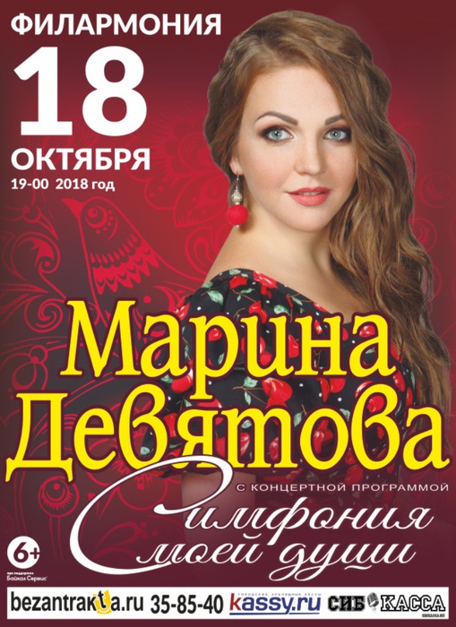 18 октября в 19.00 в городе Чите, на сцене Забайкальской краевой филармонии им. О. Лундстрема пройдёт концерт исполнительницы романсов и чудесных народных песен Марины Девятовой с новой программой "Симфония моей души" совместно с шоу-балетом «ЯR-dance».