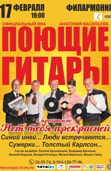 Легенда отечественной эстрады ВИА «Поющие гитары» выступит 17 февраля в Забайкальской краевой филармонии. Программа «Нет тебя прекрасней» прозвучит для читинцев в живом исполнении, абсолютно без фонограмм. «Поющие гитары» — советский вокально-инструментальный ансамбль, который был популярен в начале 1970-х годов. Наиболее известными песнями в наши дни являются «Синяя песня»(«Синий иней») и «Песенка велосипедистов». Коллектив являлся одним из первых в истории отечественной популярной музыки профессиональным коллективом, давший имя всему жанру ВИА и послуживший образцом для многочисленных последователей и подражателей В последние годы интерес к старым и новым песням ВИА «Поющие гитары», который стоит на пороге своего золотого юбилея, по-прежнему не ослабевает. Надо особо отметить, что коллектив играет только «живые» сольные концерты и принципиально не использует фонограмму.