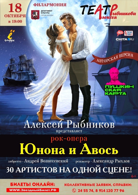 «Юнона и Авось» — самая известная рок-опера на российской сцене. Авторы – выдающийся русский композитор Алексей Рыбников и поэт Андрей Вознесенский. Постановку рок-оперы «Юнона и Авось» в авторской версии осуществил Государственный театр под руководством Народного артиста РФ, Лауреата Государственной премии РФ, композитора Алексея Львовича Рыбникова.
