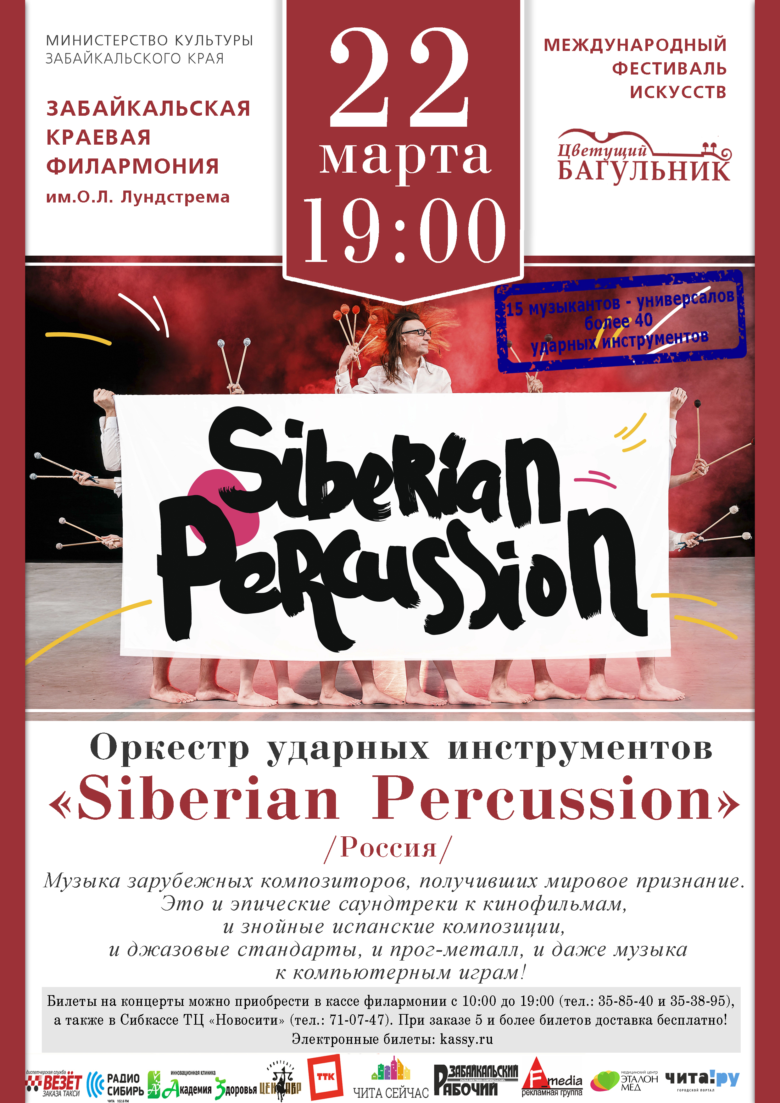 С самого начала 42 Международный фестиваль искусств «Цветущий багульник» погрузит своих слушателей в нечто удивительно прекрасное, совершенно неожиданное и крайне любопытное. 22 марта (среда), в 19:00 в Большом концертном зале Забайкальской краевой филармонии имени О.Л. Лундстрема состоится концерт оркестра ударных инструментов Красноярской краевой филармонии «Siberian Percussion».