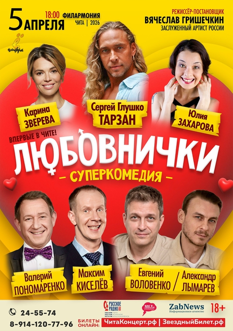 Убойная комедия интересных положений «Любовнички»! Спектакль уже посмотрели 90 000 зрителей более чем в 100 городах! В ролях: Максим Киселев, Сергей «Тарзан» Глушко, Валерий Пономаренко, Александр Лымарев / Евгений Воловенко, Карина Зверева, Юлия Захарова
