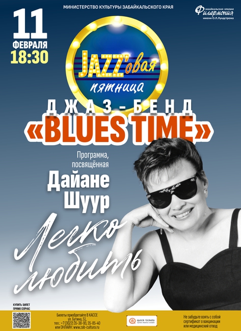 Diane Schuur – обладательница 2-х премий Грэмми, в концерте прозвучат песни в ее оригинальных аранжировках «I Close My Eyes», «Easy to love», «Louisiana Sunday Afternoon», «Unforgettable» и др., в исполнении Татьяны Аникиной и джаз-бэнда «BluesTime».