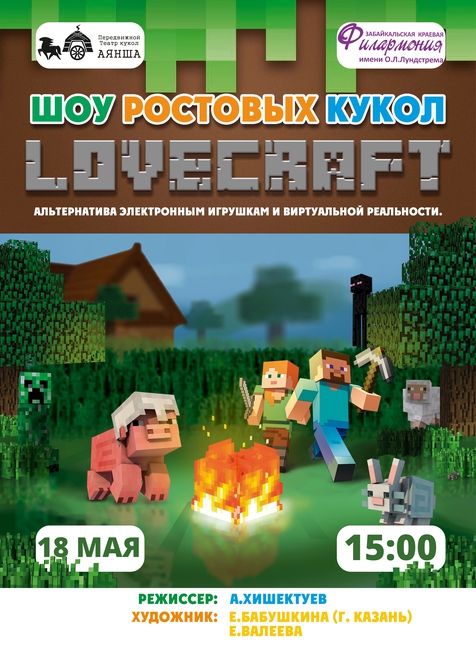 В программе зрителей ждут невероятные приключения в стране под названием «Интернет», интерактивный формат позволит детям оказаться в самом центре событий. Встреча с персонажами популярной игры Minecraft помогает доступным языком донести до детей основную мысль постановки и научить их основам безопасности в интернете. Спектакль-Шоу ростовых"LOVECRAFT"- это альтернатива электронным игрушкам и виртуальной реальности.