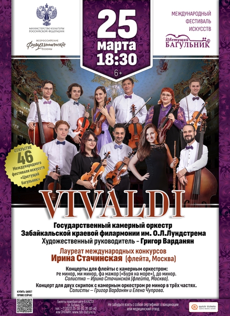 Программу «Антонио Вивальди. Венецианское барокко» представит Государственный камерный оркестр филармонии и известная Российская флейтистка, лауреат Международных конкурсов Ирина Стачинская (Москва). Концерт проходит в рамках проекта «Всероссийские Филармонические сезоны».