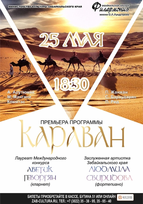 25 мая В камерном зале Забайкальской филармонии лауреат международного конкурса Аветик Геворгян (кларнет) и заслуженная артистка Забайкальского края Людмила Свиридова (фортепиано) представят премьерную программу «Караван». Гости филармонии почувствуют атмосферные произведения А.Аратюняна, М. Мангани, П. Жанжан, П.Рид и других известных композиторов. Виртуозный и гибкий звук кларнета поможет зрителям полностью погрузится в тематику концерта. Успевайте приобрести билеты в кассах Забайкальской краевой филармонии или онлайн.