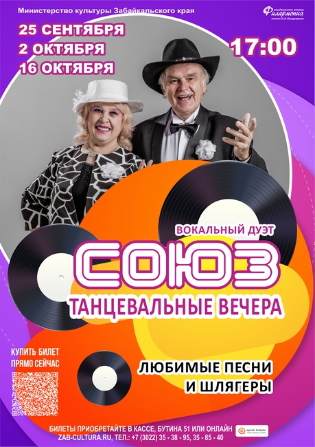 25 сентября в 17:00 приглашаем читинцев на открытие танцевального сезона с вокальным дуэтом «СОЮЗ». Любимые песни и шлягер станут отличным дополнением выходного дня и создадут атмосферу праздника советских времен.