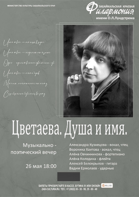 26 мая в 18:30 ансамбль «Sotto Voce» представит музыкально-поэтический вечер, посвященный творчеству Марины Цветаевой «Цветаева. Душа и имя». В программе: стихотворения, песни и романсы на тексты Марии Ивановны.