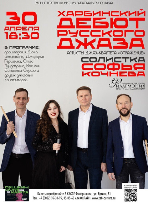 Напоминаем, что уже сегодня в 18:30 в концертном зале филармонии артисты джаз-квартета «Отражение» представят зрителям концертную программу, посвященную творчеству великого русского джазмена Олега Лундстрема в Харбине.