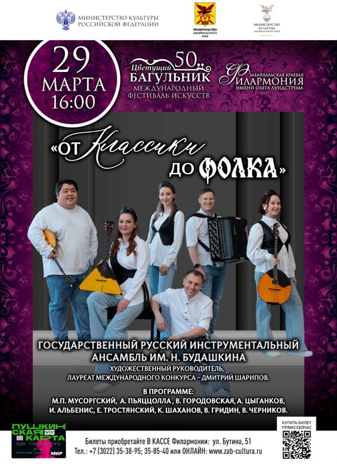 Программа «От классики до фолка» в исполнении Государственного русского инструментального ансамбля имени Николая Будашкина — это музыкальный маршрут, где нет границ.Где гусли поют в унисон с Пьяццоллой, балалайка звучит ультрасовременно, а домра спорит по темпераменту с электрогитарой.