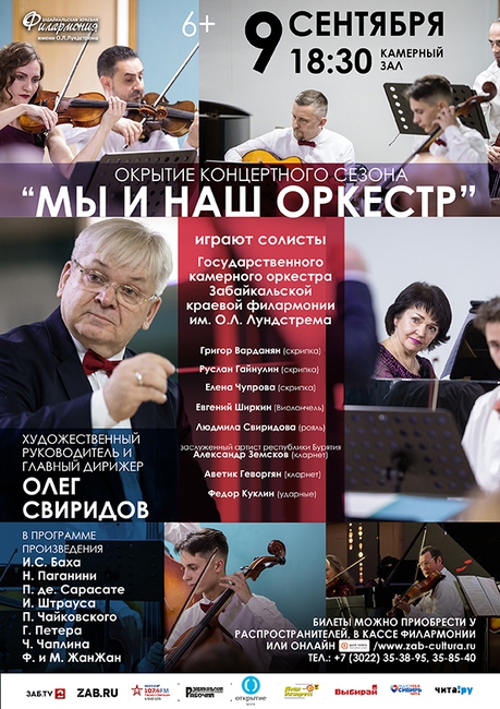 Это будет замечательное музыкальное событие. Камерный Государственный оркестр представит новых артистов, которые приехали в Читу из других городов и даже стран. Зрители услышат сольные выступления артистов оркестра. В новой программе «Мы и наш оркестр» будут исполнены произведения Иоганна Себастьяна Баха, Никколо Паганини, Пабло де Сарасте, Иоганна Штрауса, Гензеля Петера, Чарли Чаплина, Фаустина и Мориса Жан-Жан.