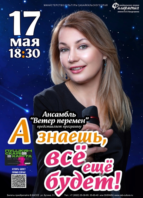 17 мая в 18:30 на сцене органного зала Забайкальской филармонии премьерную концертную программу «А знаешь все еще будет…» представит ансамбль «Ветер перемен».