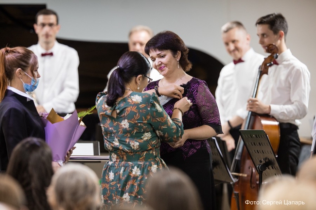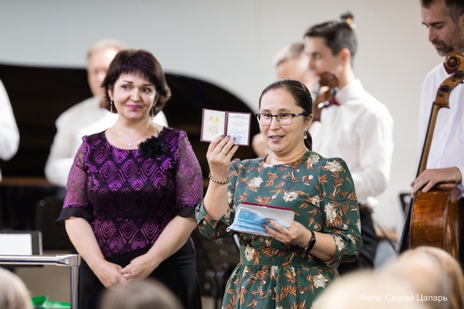 Открытие концертного сезона в Камерном зале филармонии стало двойным праздником. Почетное звание «Заслуженный артист Забайкальского края» сегодня было присвоено Людмиле Свиридовой. Награду вручила исполняющая обязанности заместителя Председателя Правительства Забайкальского края Татьяна Цымпилова.