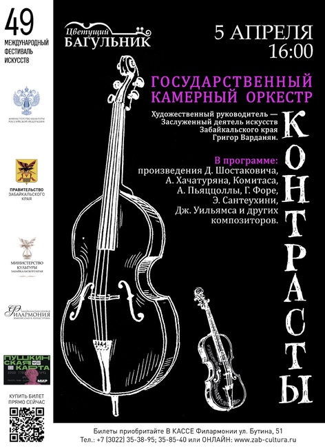 5 апреля в 16:00 в рамках 49-го Международного фестиваля искусств «Цветущий багульник» на сцене большого зала филармонии концертную программу «Контрасты» представят артисты Государственного камерного оркестра (художественный руководитель – Заслуженный деятель искусств Забайкальского края Григор Варданян).