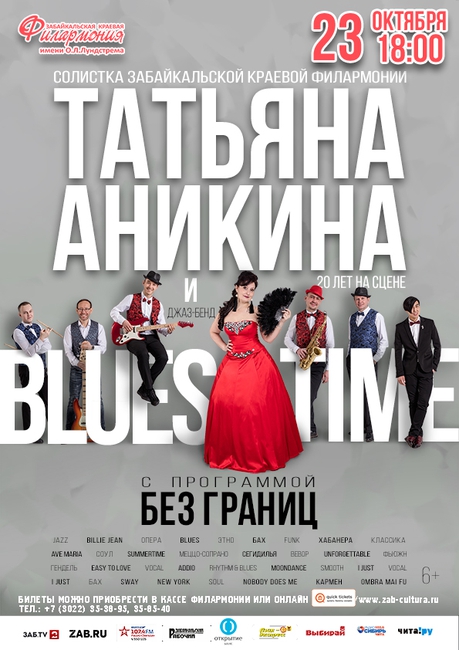 23 ноября в 18.00 на большой сцене краевой филармонии состоится концерт «Без границ», посвященный 20-летию творческой деятельности солистки краевой филармонии, художественного руководителя джазбэнда «Blues Time», Татьяны Аникиной. Вас ожидает неповторимый музыкальный праздник, где соединяется классика и джазовые стандарты.
