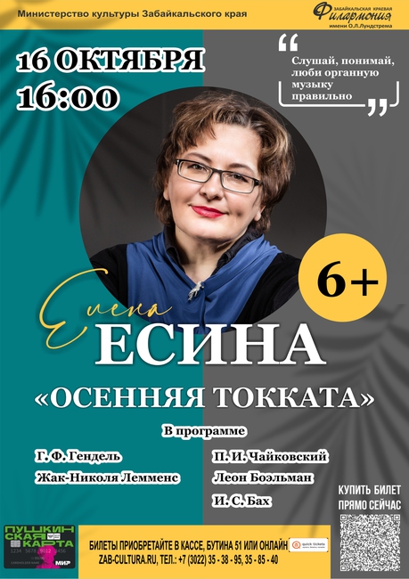 Суббота 16 октября для гостей филармонии станет особенной. Солистка филармонии Елена Есина (орган) лауреат международных и всероссийских конкурсов представит новую концертную программу «Осенняя Токката» .