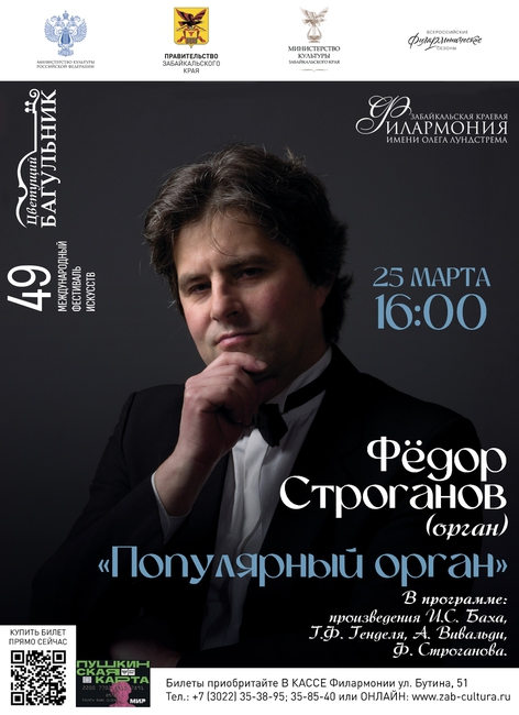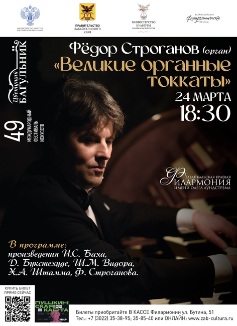 В этом году концертная программа 49-го Международного фестиваля искусств «Цветущий Багульник» откроется его концертами 24 марта в 18:30 программой «Великие органные токкаты» и дневным концертом 25 марта в 16:00 «Популярный орган».