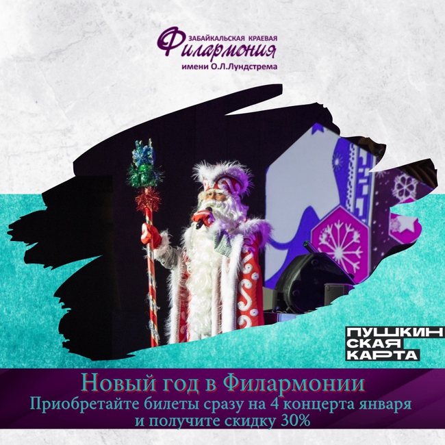 Филармония подготовила для вас отличное Новогоднее предложение, встретим праздники музыкально: приобретайте билеты на 4 концерта января (4,5,6,8) и получите в подарок скидку 30%!