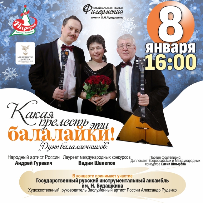 8 января в 16:00 концертную программу, «Какая прелесть эти балалайки», представит дуэт балалаечников: народный артист России Андрей Гуревич и лауреат Международных конкурсов Вадим Шелепов. Партия фортепиано: Дипломант Всероссийских и Международных конкуров Елена Шмырева. В концерте принимает участие ГРИА имени Николая Будашкина.