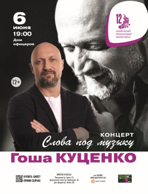 Заслуженный артист России, актёр театра и кино Гоша Куценко приглашает забайкальцев на свой творческий вечер «Слова под музыку», который пройдет 6 июня в 19:00 в в рамках XII Забайкальского кинофестиваля на сцене Дома Офицеров.