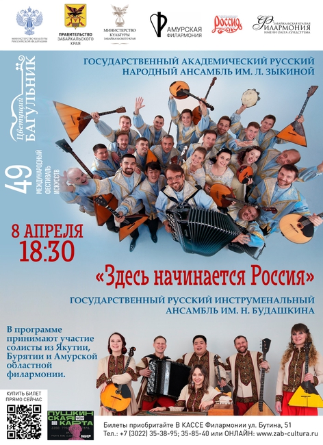 8 апреля в 18:30 в рамках 49-го Международного фестиваля культуры и искусств «Цветущий багульник» пройдет совместный концерт «Здесь начинается Россия» Государственного академического русского народного ансамбля «Россия» имени Л. Г. Зыкиной и Государственного русского инструментального ансамбля имени Николая Будашкина призванный объединить в общее культурное пространство жителей регионов Дальневосточного федерального округа.