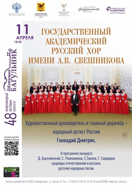11 апреля в 18:30 в рамках 48-го Международного фестиваля искусств «Цветущий Багульник» в большом концертном зале филармонии в специально подготовленной для фестиваля программе всемирно известный коллектив Государственный академический русский хор им. А.В.Свешникова исполнит русские народные песни, а также классические произведения для хора в обработке Александра Свешникова и Алексея Ларина.