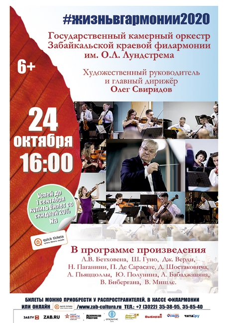 24 октября в 18:30 в большом зале Забайкальской краевой филармонии им. О.Л.Лундстрема в рамках 9-го музыкального фестиваля "Жизнь в гармонии" состоится концерт Государственного камерного оркестра.