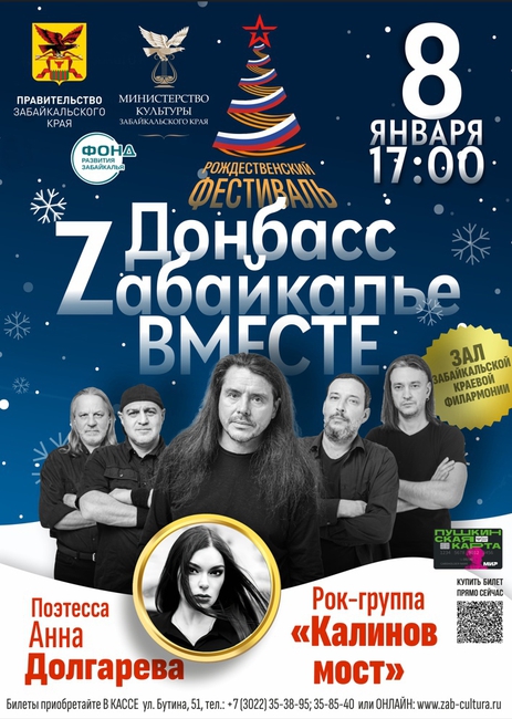 8 января в 17:00 в рамках рождественского фестиваля «Донбасс и Zабайкалье. Вместе» российская группа «Калинов Мост» и российская поэтесса Анна Долгарева в большом концертном зале Забайкальской филармонии представят забайкальцам специально подготовленную для фестиваля программу.