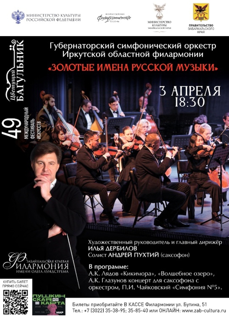 3 апреля в 18:30 в рамках 49-го Международного фестиваля искусств «Цветущий багульник» на сцене большого концертного зала Губернаторский симфонический оркестр Иркутской областной филармонии представит концертную программу «Золотые имена русской музыки».