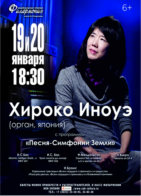 19 и 20 января в 18:30 забайкальскими зрителями встретиться органистка Хироко Иноуэ. Лауреат международных конкурсов органистов им. М. Галанти (Италия, 2004), Валерия Кикты (Москва, 2005), дипломант Международного конкурса органистов им. М. Таривердиева (2005). В репертуаре Хироко Иноуэ несколько фундаментальных сольных программ.