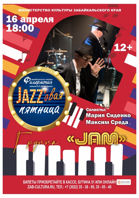 16 апреля в 18:00 проект «Джазовая пятница» 12+! Новую концертную программу представит группа «JAM» и солисты Максим Среда и Мария Сиденко.
