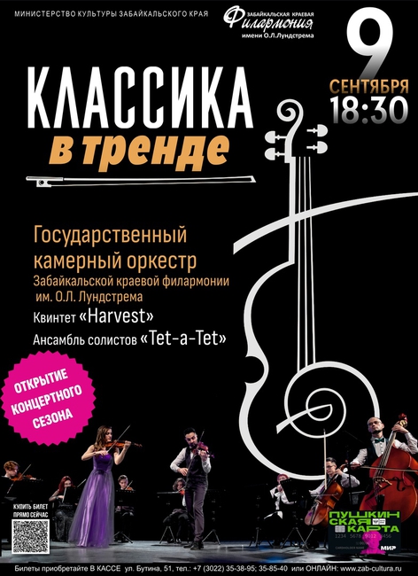 9 сентября в 18:30 Открытие концертного сезона-концерт «Классика в тренде» Государственный камерный оркестр забайкальской краевой филармонии им. О.Л.Лундстрема ( художественный руководитель-Григор Варданян) Квинтет «Harvest», Ансамбль солистов «Тет-а-тет» (художественный руководитель- заслуженная артистка Забайкальского края Людмила Свиридова). В исполнении коллективов прозвучат произведения композиторов эпох классицизма, романтизма и современности