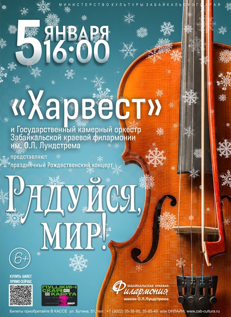 5 января в 16:00 накануне Рождественского сочельника в большом концертном зале филармонии традиционную праздничную концертную программу «Радуйся мир!» представят артисты Государственного камерного оркестра и квинтета «Харвест».