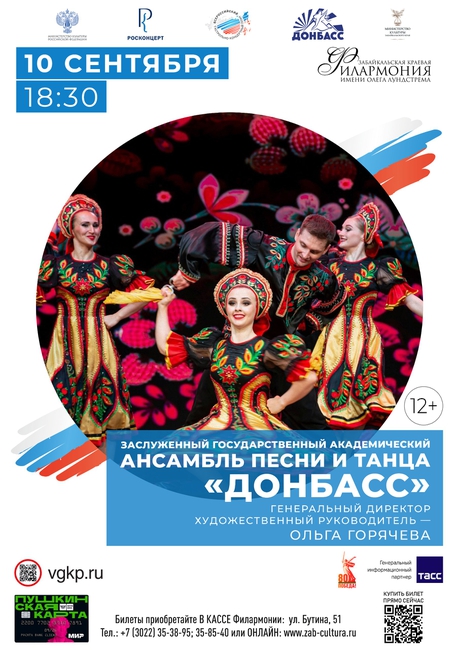 10 сентября в 18:30 на сцене большого концертного зала впервые в Забайкалье концертную программу «Многонациональный Донбасс» представит Заслуженный государственный академический ансамбль песни и танца «Донбасс» под руководством генерального директора и художественного руководителя Ольги Горячевой.
