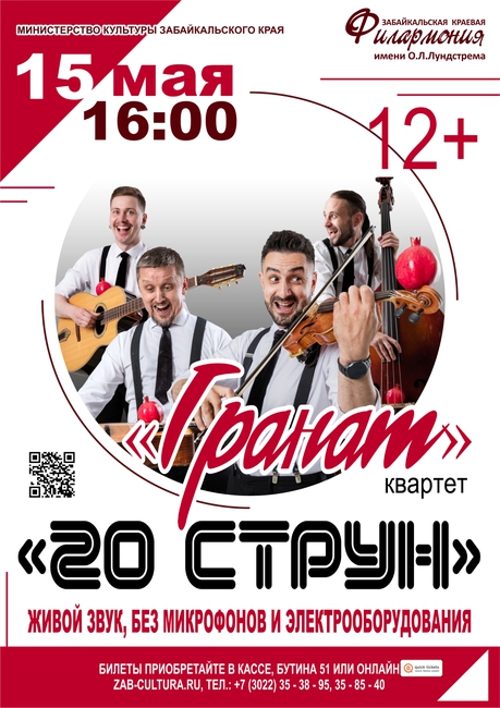 Новую концертную программу «20 струн» представит уникальный квартет «Гранат». Гости филармонии погрузятся в неповторимую атмосферу концертной программы без электрооборудования и микрофонов, только живой звук.