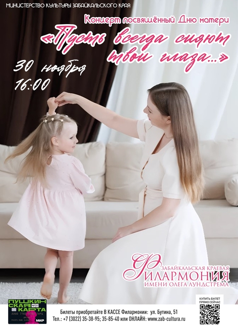 30 ноября в 16:00 на сцене большого концертного зала филармонии артисты представят музыкальный подарок «Пусть всегда сияют твои глаза…». Программа, наполненная любовью, благодарностью и нежностью, станет искренним признанием в любви всем матерям Забайкалья.