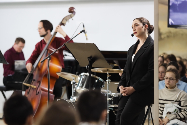 Артисты джаз-квартета «Отражение» и режиссер-постановщик Виктория Фишер (художественное слово) открыли для зрителей страницы истории нашей страны, которые должен знать каждый.