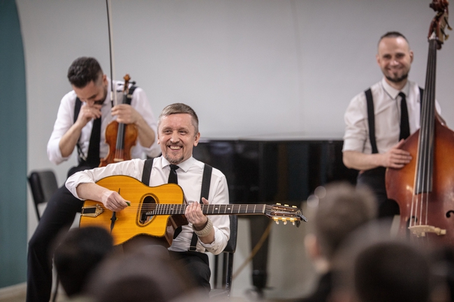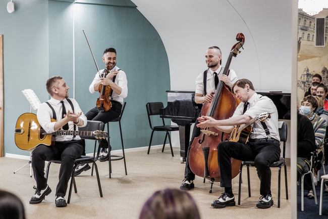 Зрителю посчастливилось услышать популярные во всем мире джазовые композиции, исполненные без дополнительно звукового оборудования на 20 струнах акустических инструментов - двух гитар, скрипки, контрабаса. Каждая композиция была виртуозно исполнена артистами квартета «Гранат», а зрители не пожалели восторженных аплодисментов!