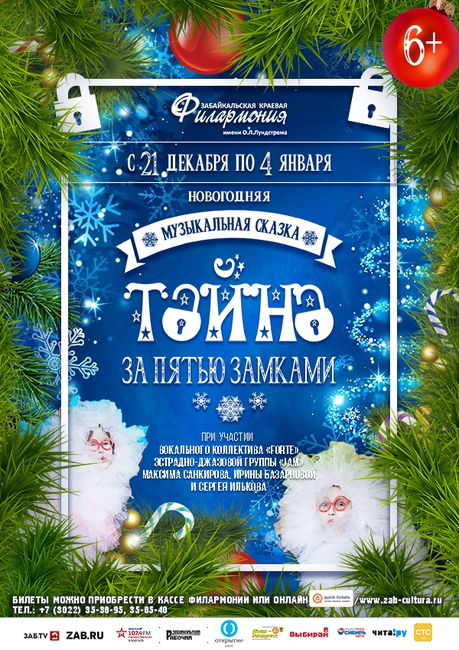 В большом концертном зале филармонии всех ожидает новогоднее музыкальное представление «Тайна за пятью замками». Тетушка Сказка и необычные сказочные Фьёки подарят незабываемое путешествие, юные зрители помогут принцессе Звездочке и Деду Морозу, раскрыть тайну за пятью замками и узнать, что же Баба Яга, Леший и вокально-инструментальным ансамбль «Дикие гитары» под предводительством Кота Батона украли для празднования Нового года у Кощея.