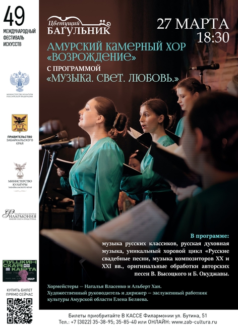 27 марта в 18:30 в рамках 49-го Международного фестиваля искусств «Цветущий багульник» на сцене большого концертного зала филармонии юбилейную концертную программу «Музыка. Свет. Любовь» представит один из старейших творческих коллективов Приамурья – Амурский камерный хор «Возрождение».