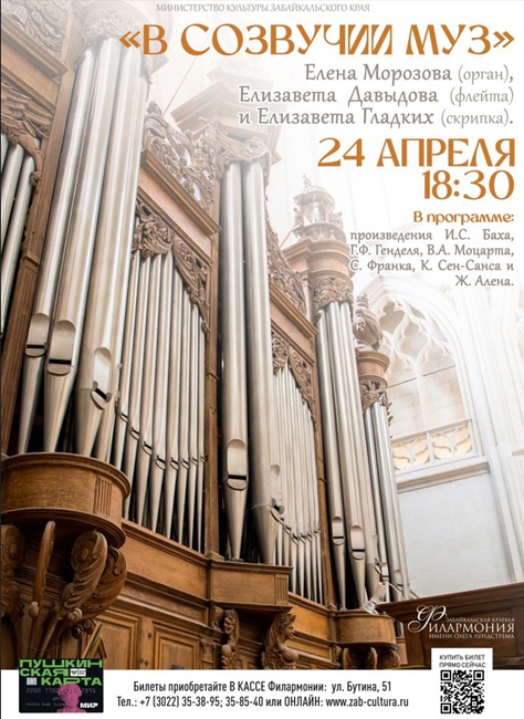 24 апреля в 18:30 в органном зале филармонии солистки Забайкальской краевой филармонии Елена Морозова (орган), Елизавета Давыдова (флейта) и Елизавета Гладких (скрипка) представят для зрителей программу «В созвучии муз».