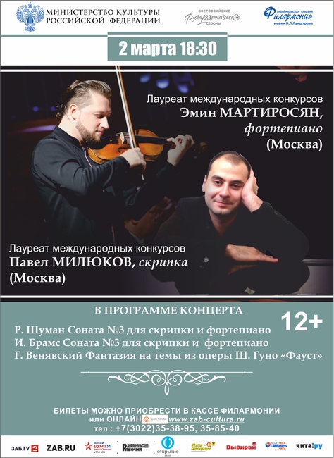 Известные по всему миру музыканты вновь прозвучат в стенах большого концертного зала филармонии. Артисты в этом году представят забайкальскому зрителю новую программу (Р. Шуман; И. Брамс; Г. Венявский, из оперы Ш. Гуно «Фауст»), которая покорит сердце каждого любителя классической музыки.