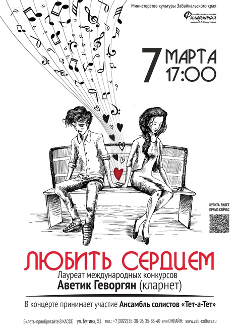 7 марта в 17:00: Концерт лауреата международных конкурсов Аветика Геворгяна (кларнет) и Заслуженной артистки Забайкальского края Людмилы Свиридовой (фортепиано) «Любить Сердцем».