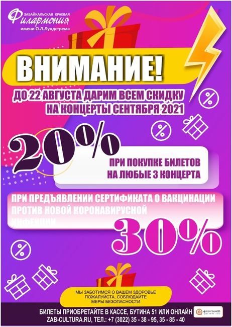 Забайкальская Краевая Филармония заботится о вашем здоровье! Мы тщательно следим за соблюдением противоэпидемиологических рекомендаций на мероприятиях: социальная дистанция, масочный режим, наличие антисептиков для гостей, дезинфекция помещений, рециркуляция воздуха, бесконтактная термометрия гостей и сотрудников.