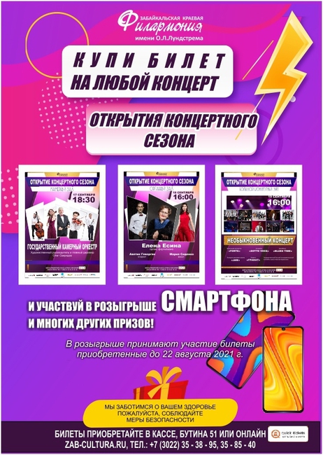 Это еще не всё! Помимо возможности приобрести билеты ВЫГОДНО, Филармония предлагает участвовать в розыгрыше СМАРТФОНА и многих других призов! Для этого необходимо приобрести билеты на концерты до 22 августа. Подробности в кассе ЗК Филармония.